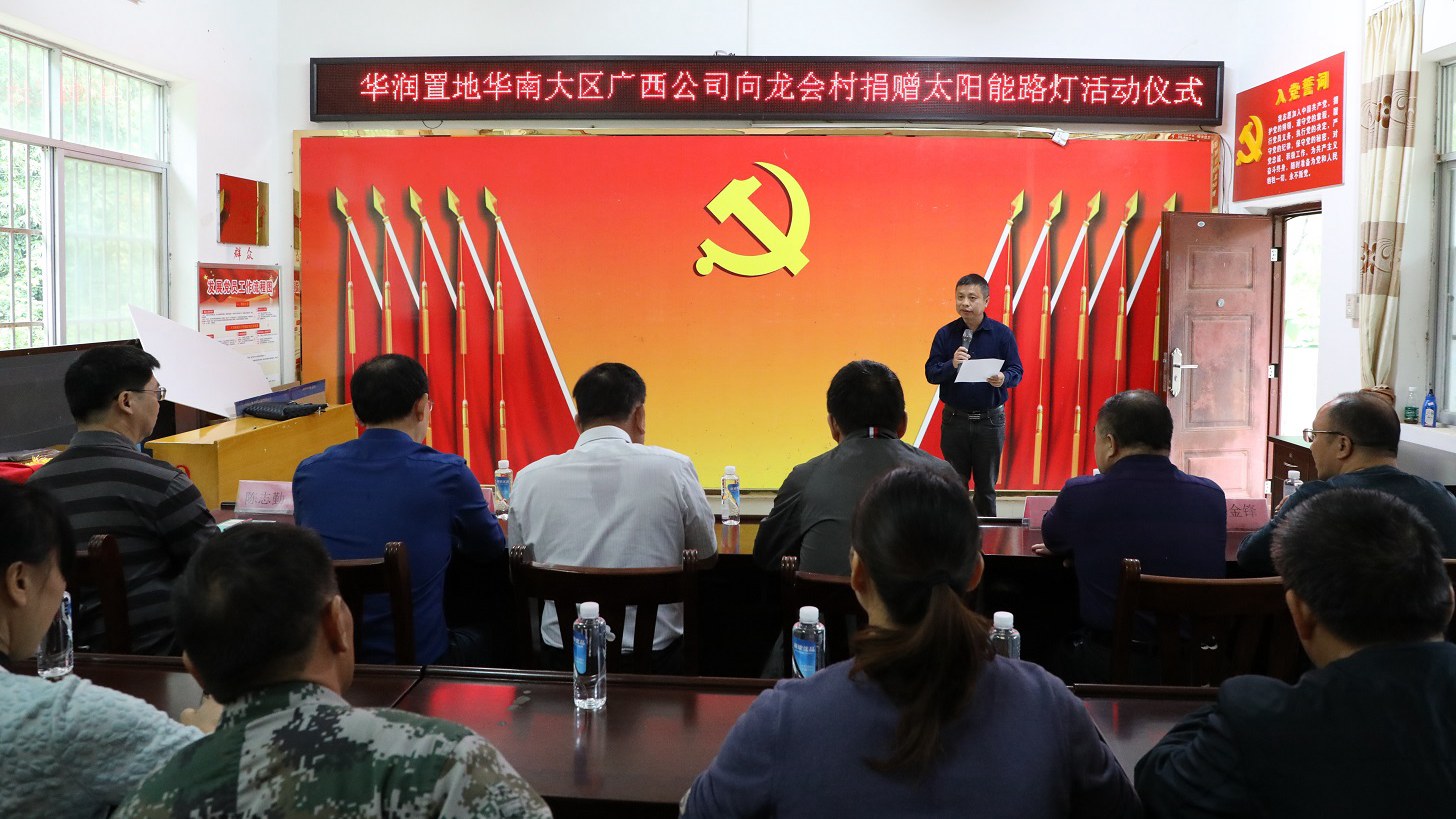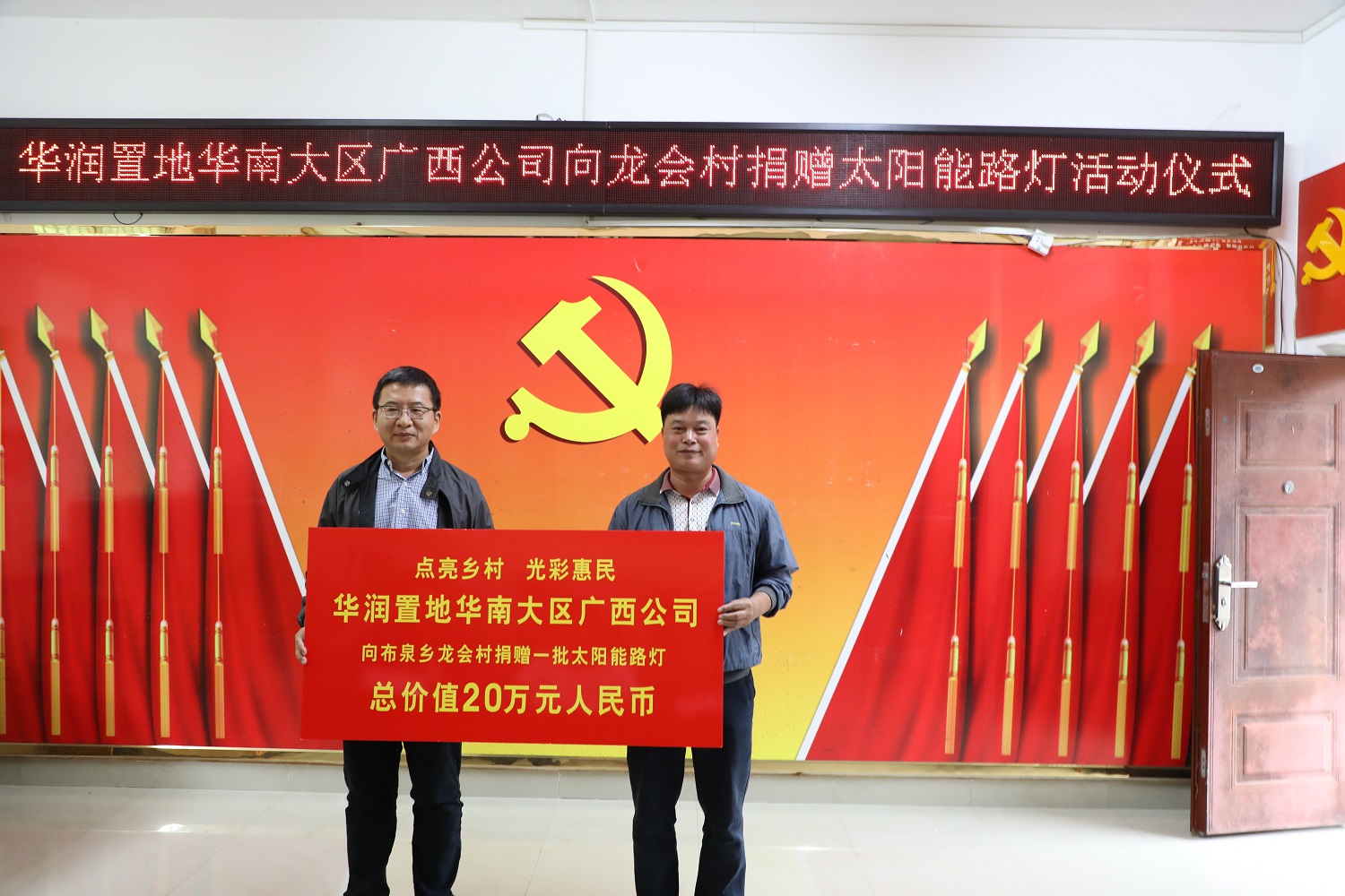 10月14日,南寧市自然資源局?jǐn)y愛心企業(yè)華潤(rùn)置地華南大區(qū)廣西公司到我院結(jié)對(duì)幫扶貧困村布泉鄉(xiāng)龍會(huì)村開展扶貧捐贈(zèng)活動(dòng),向龍會(huì)村捐贈(zèng)一批價(jià)值20萬(wàn)元的太陽(yáng)能路燈,助力鄉(xiāng)村振興。