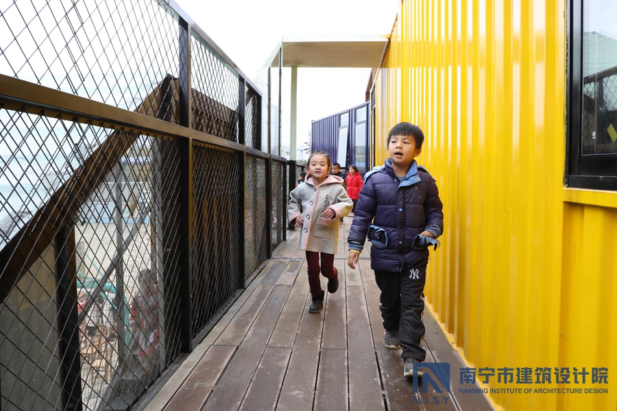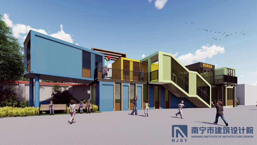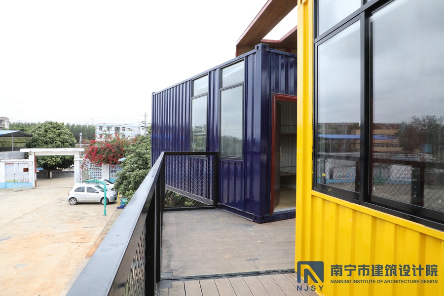 項(xiàng)目采用了集裝箱房屋的形式,由10個(gè)集裝箱構(gòu)成,通過(guò)堆積木的形式,根據(jù)學(xué)生兒童所需的建筑風(fēng)格和功能需求,將集裝箱橫豎排列,形成一定的退臺(tái)和露臺(tái)空間,為孩子們提供更多共享活動(dòng)空間。