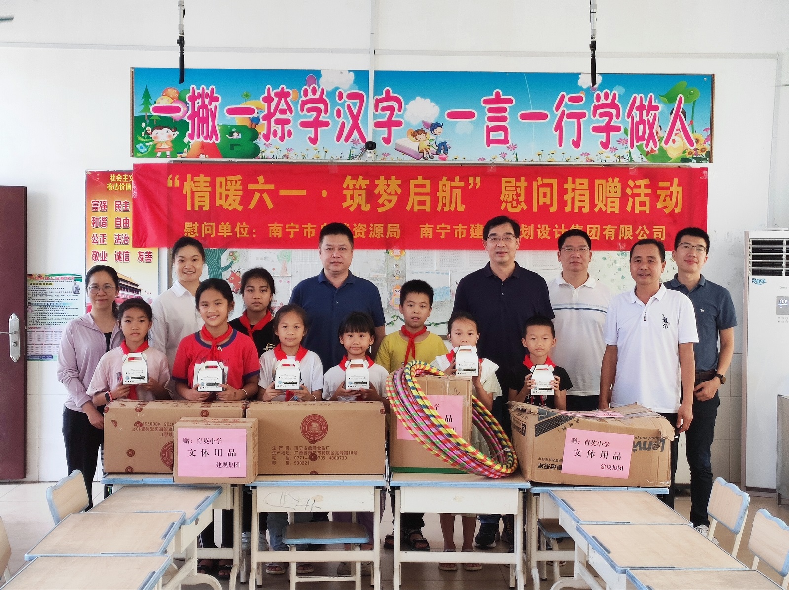 5月30日至31日,值此第72個(gè)國(guó)際兒童節(jié)到來(lái)之際,南寧市自然資源局副局長(zhǎng)、三級(jí)調(diào)研員李伍堅(jiān),局黨組成員、副局長(zhǎng)蔣東勇分別帶隊(duì)到集團(tuán)定點(diǎn)幫扶的上林縣大豐鎮(zhèn)擁軍村玉柴希望小學(xué)、隆安縣古潭鄉(xiāng)育英村小學(xué)開(kāi)展“情暖六一·筑夢(mèng)啟航”慰問(wèn)活動(dòng)。