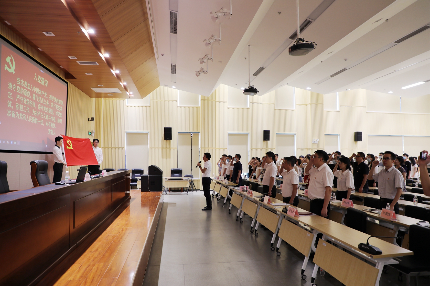 “我志愿加入中國共產(chǎn)黨,擁護(hù)黨的綱領(lǐng)……”錚錚誓言,拳拳初心。全體與會黨員面向鮮紅的黨旗,莊嚴(yán)地舉起右拳,用慷慨激昂的誓言重溫入黨時許下的莊嚴(yán)承諾,衷心表達(dá)對黨的絕對忠誠和為黨的事業(yè)奮斗終身的決心和愿望。